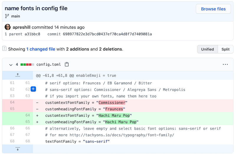 You may choose fonts for headings and body text in your site’s config.toml file. Scroll down to find:
